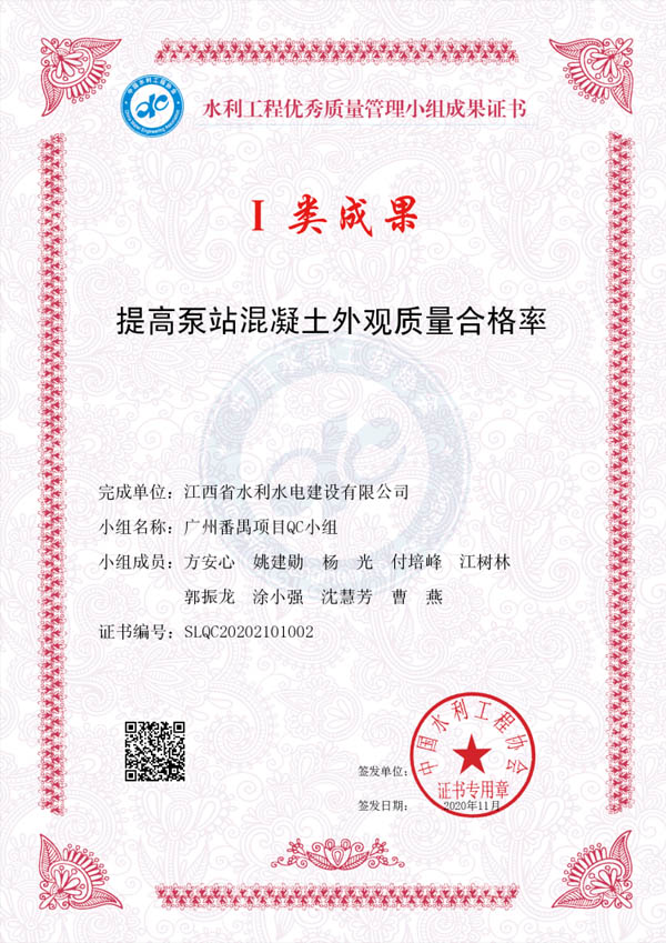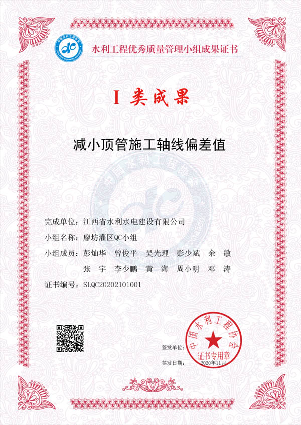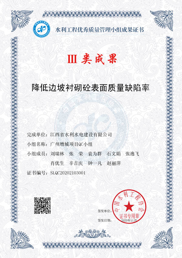 其中:廖坊灌區(qū)QC小組編寫的《減小頂管施工軸線偏差值》獲I類成果獎、廣州番禺項目QC小組編寫的《提高泵站混凝土外觀質量合格率》獲I類成果獎、廣州增城項目QC小組編寫的《降低邊坡襯砌砼表面質量缺陷率》獲III類成果獎。