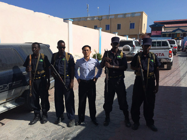 我們?nèi)胱〉氖前雿u皇宮酒店,也是中國駐索使館的臨時辦公產(chǎn)所。三道門的安全防護(hù)可謂警備森嚴(yán),戰(zhàn)爭國家的氣象從這可見一斑。酒店內(nèi)布置簡單,但設(shè)施齊全,與酒店外充滿殺氣的氣氛不同,酒店內(nèi)人來人往,商人喝著咖啡悠閑地談著生意。我們也坐著邊喝咖啡邊商談工作計劃,不時有索馬里人來打招呼,用中文說“你好”,并客氣地握手表示熱情歡迎來到摩加迪沙。