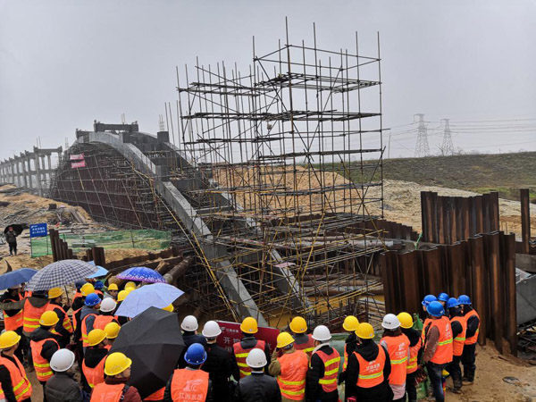 首日,學習團冒著寒風和細雨,先后參觀了西干渠三區(qū)地下頂管技術(shù)現(xiàn)場、渡王家渡拱式渡槽技術(shù)現(xiàn)場,一分干渠曾家渡碗式渡槽完工段。彭燦華、曾俊平、馬小毛等項目管理人員,先后就技術(shù)特點、質(zhì)量安全控制要點、技術(shù)方案比選、經(jīng)濟效益分析等,向?qū)W習團一行作了介紹。