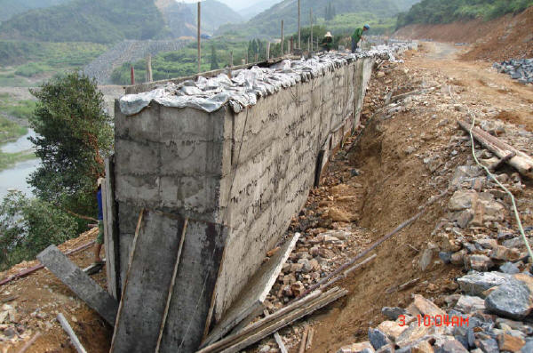 擋墻砌筑應(yīng)分層,每一砌筑層擺石時(shí)均應(yīng)座漿,隨鋪漿隨砌筑。嚴(yán)禁石塊大面無漿直接貼靠?;炷帘仨氂谜駬v器逐縫振搗。當(dāng)豎縫寬度在5cm以上時(shí),可填漿后塞片石。嚴(yán)禁先堆砌石塊再用膠結(jié)料灌縫。